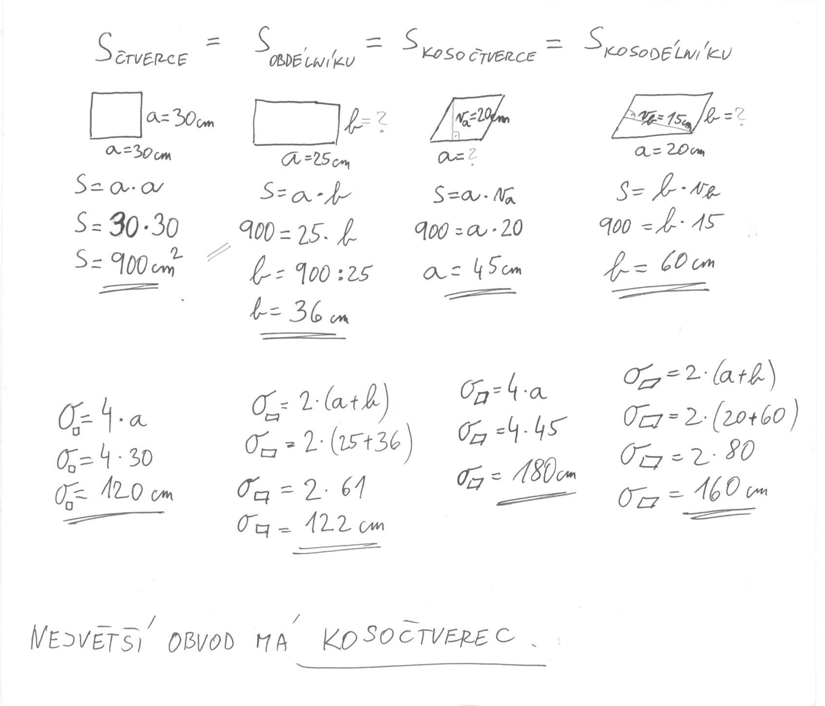 Čtverec, obdélník, kosočtverec a kosodélník mají stejný obsah. Urči výpočtem, který z těchto rovnoběžníků má největší obvod, jestliže strana (popř.výška):