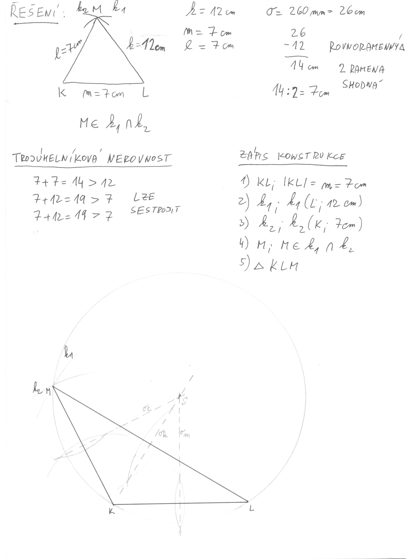 Narýsuj rovnoramenný trojúhelník KLM, který má základnu k = 12 cm a obvod o = 260 mm.