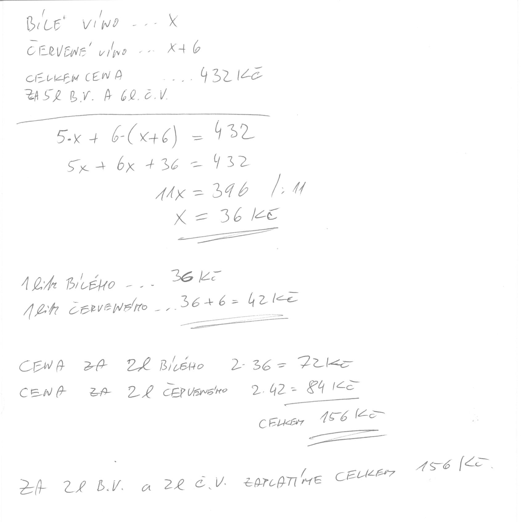 Pět litrů bílého vína a šest litrů červeného vína stojí dohromady 432 Kč. Jeden litr červeného vína je o 6 Kč dražší než jeden litr bílého vína. Vypočítej, kolik korun zaplatíme při koupi dvou litrů bílého a dvou litrů červeného vína dohromady.