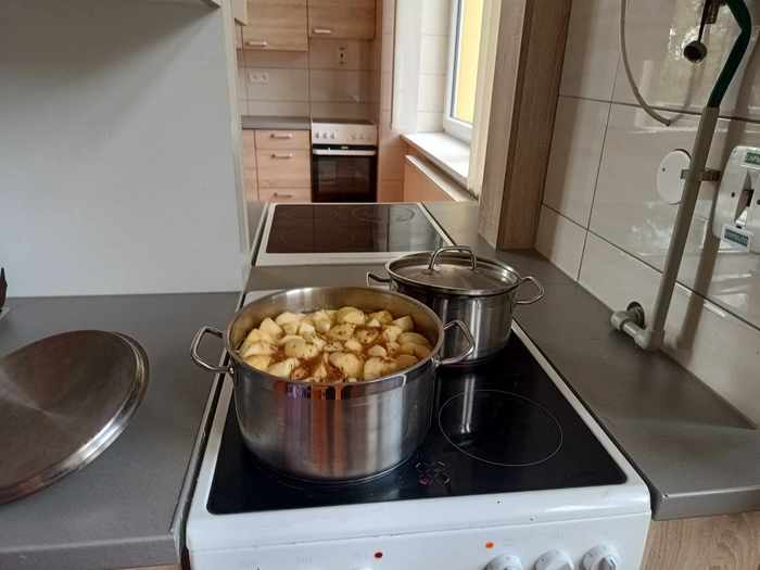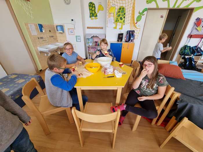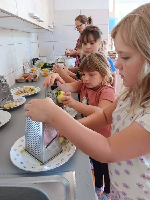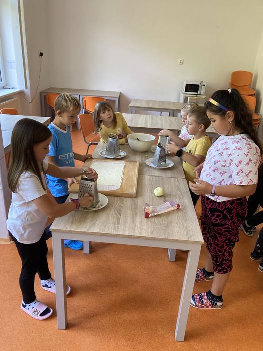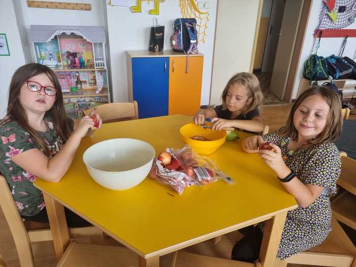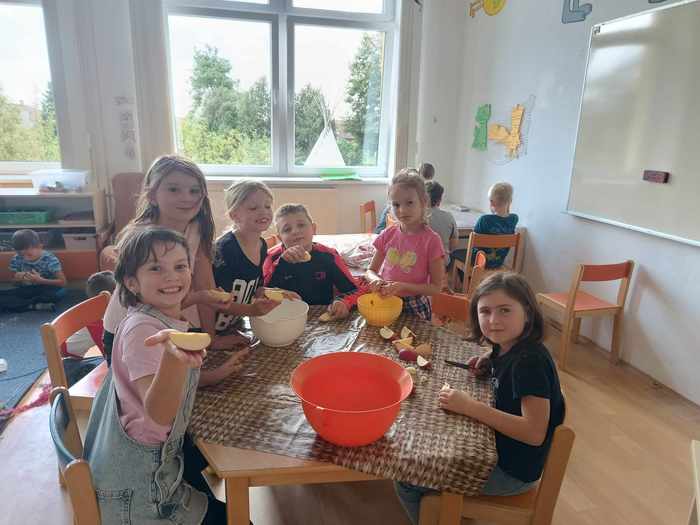 Třetí oddělní si zkusilo pracovat s akvarelovými barvami a jablíčka malí výtvarníci zkoušeli tisknout, čtvrté zase tvořilo přáníčka ve tvaru jablíček. Obě oddělní se dohodla na uvaření pravého jablečného kompotu, a tak si děti samy jablka oloupaly a nakrájely.