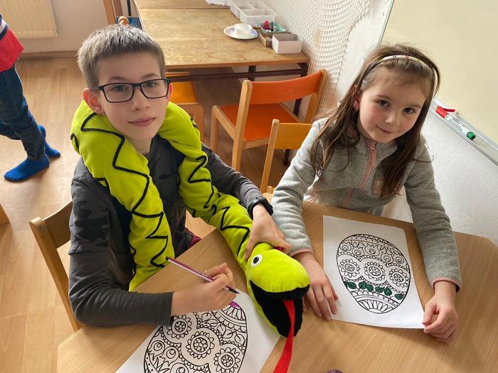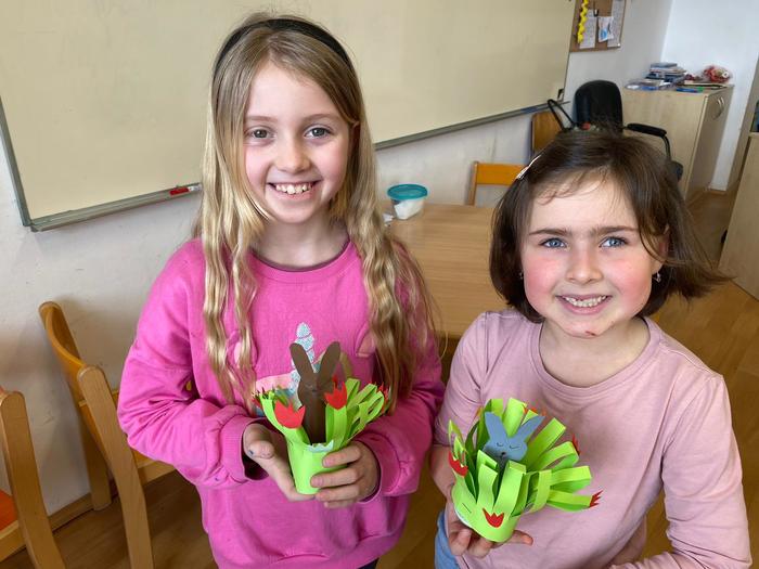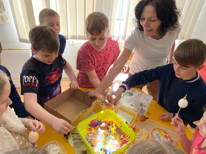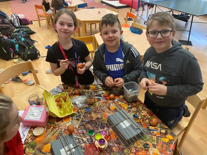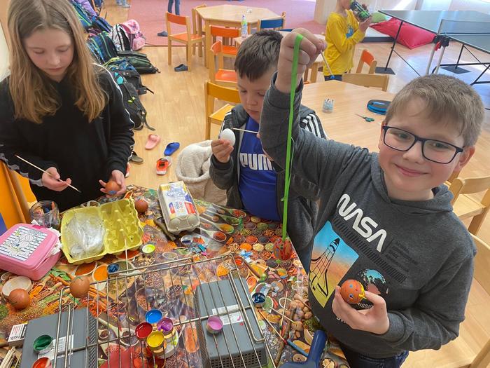 Tři dny před velikonočními prázdninami se družiny proměnily v dílničky. Děti zdobily kraslice voskem, lakem na nehty, obtisky se zvířátky nebo jen vlastní malbou temperami a fixami. Vytvářely se dekorace z papíru v podobě zahrádek a zajíčků, pekly se jidáše a pletly se pomlázky.