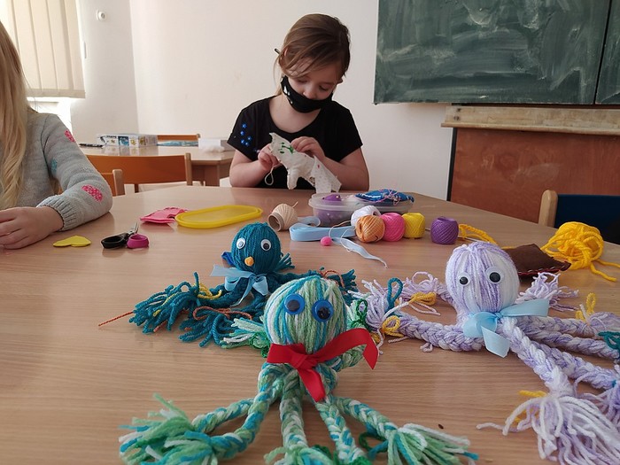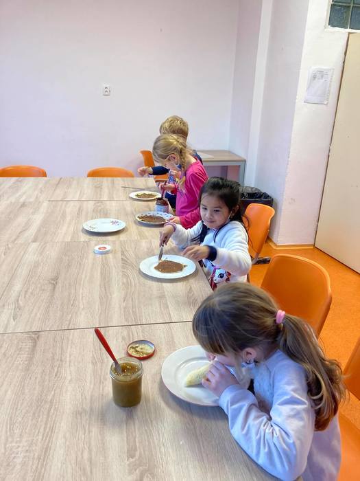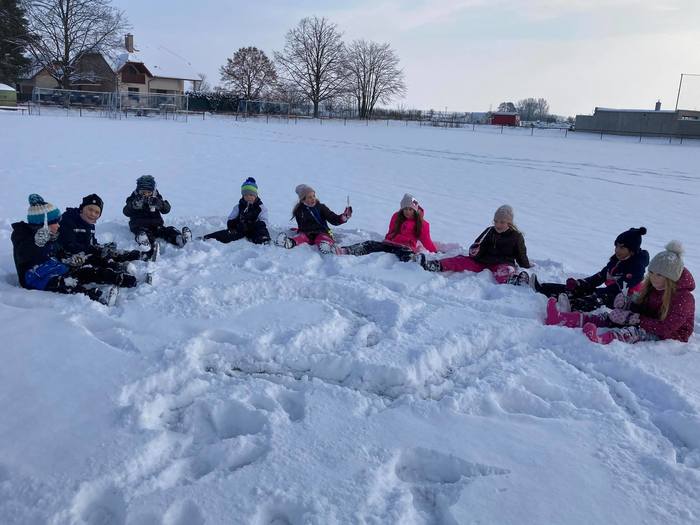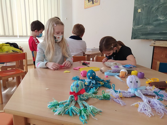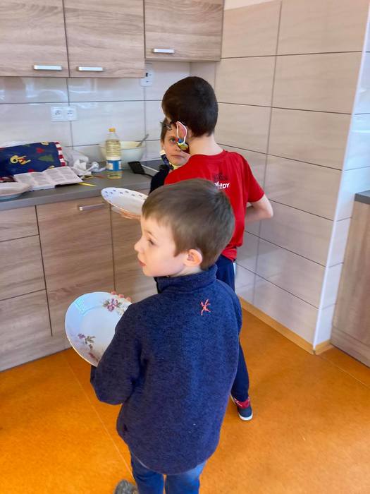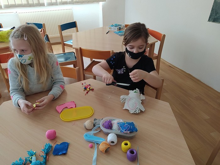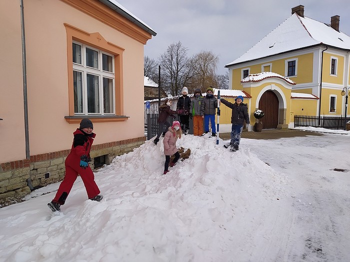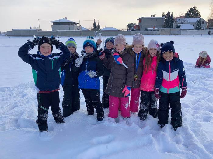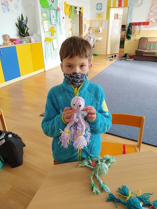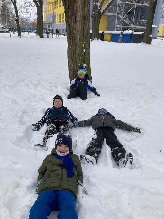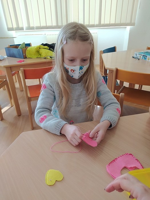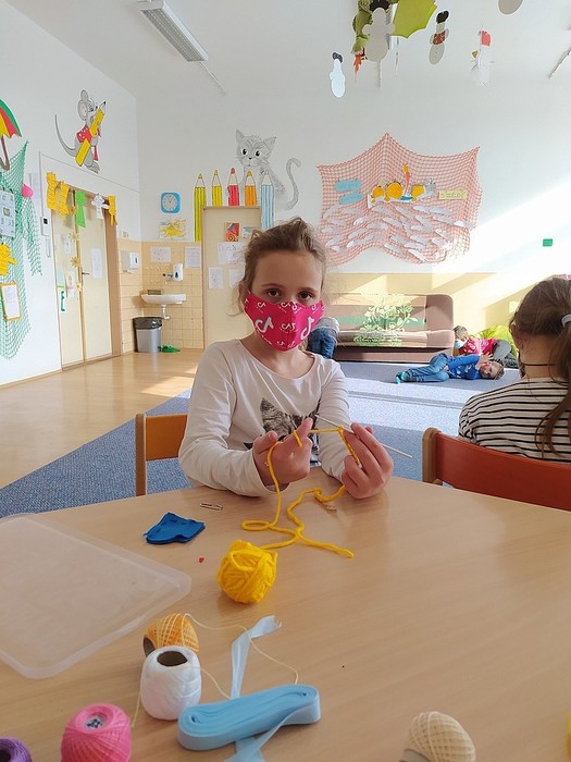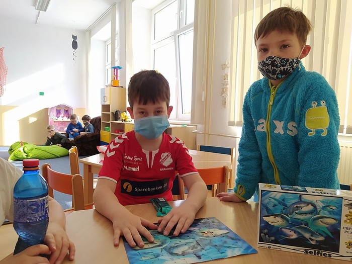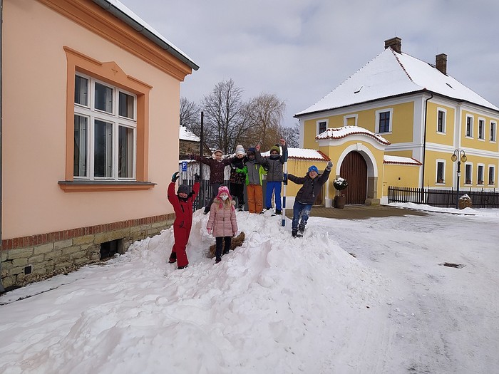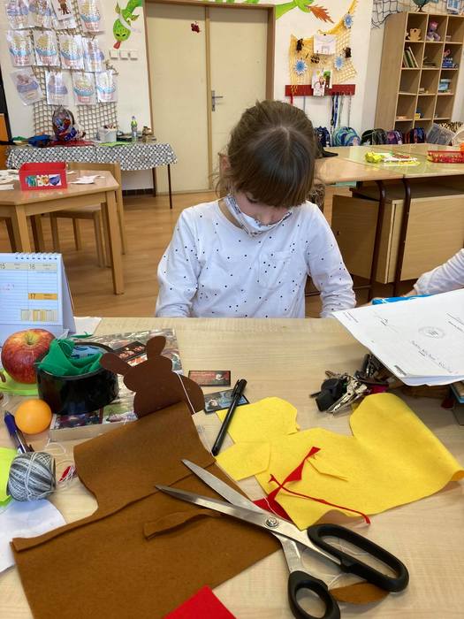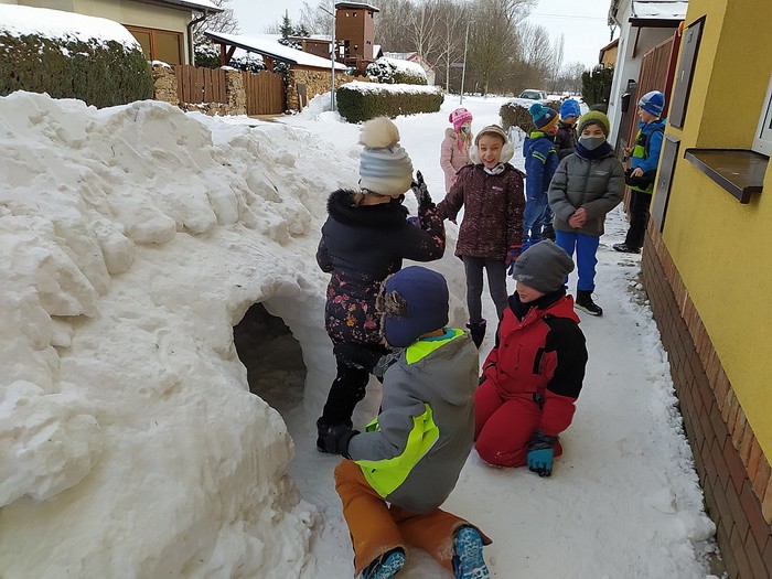 Dovádění a smích druháčků nyní provází třetí a čtvrté oddělení. Děti se s vychovatelkami velice rychle seznámily a hned se zapojily do různých aktivit. Nechyběla návštěva naší skvěle vybavené kuchyňky, kde jsme pekli muffiny a smažili palačinky, které se mlsaly s Nutellou. Vařili jsme zdravou vločkovou kaši s ovocem a se skořicí, a došlo i na výrobu naprosto skvělé pomazánky z mrkve a z červené řepy. Ve třídě děti kromě společného hraní nejraději šily. Nejprve se pilně učily základním stehům a pak společně vyráběly medvídky, autíčka, panáčky, polštářky a vše, co je napadlo. Stačilo použít různé šablony a pak jen dodělat uši, čumáček nebo zobáček. Tak vznikali nejrůznější zvířecí a jiní kamarádi. Musíme velmi pochválit kluky, kteří šili se stejným zápalem jako dívky. Kdyby nebylo sněhu, nedostaneme snad děti od šití vůbec ven. Toho nám naštěstí napadlo dokonale. Takže po koulování, válení se ve sněhové pokrývce a dělání andělíčků došlo i na stavění sněhuláků a sněhové slepičky. Také jsme se pravidelně vydávali na průzkum Dašic a prohlíželi krásná sněhová zákoutí.