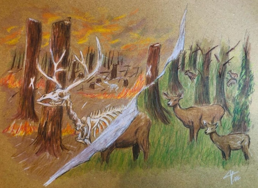 Od dětství si přeju, abychom žili v souladu s přírodou. K nakreslení tohoto obrázku mě inspirovalo i to, jak krutě se k ní lidé chovají. Mé velké přání je, aby se lidé více starali o přírodu a chovali se k ní lépe. Tvoření je pro mě potěšením, protože mi vzniká pod rukama dílo, kterým mohu předat svoje pocity druhým. Mým dalším přáním je, aby mladí výtvarníci vždy kreslili pro radost, o kterou se tak mohou podělit s ostatními.