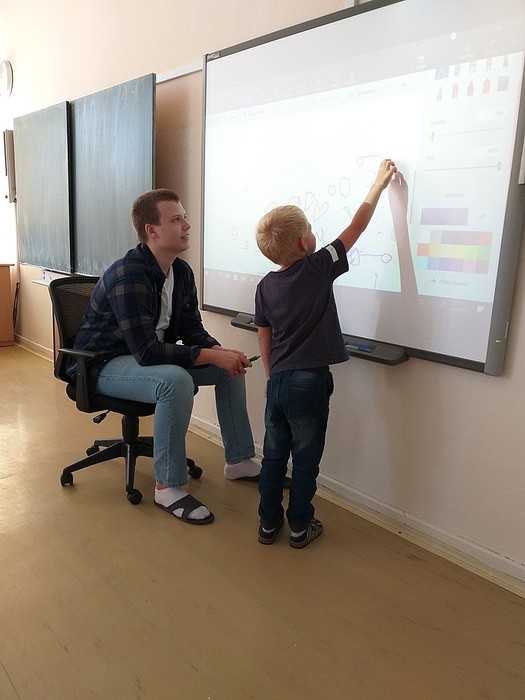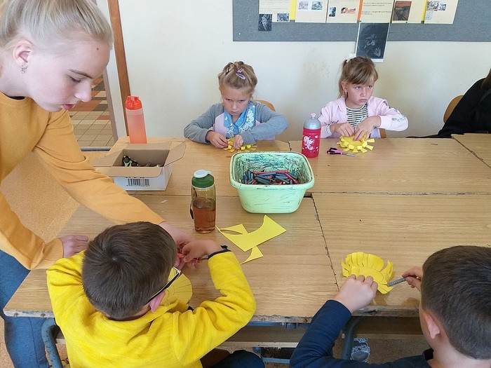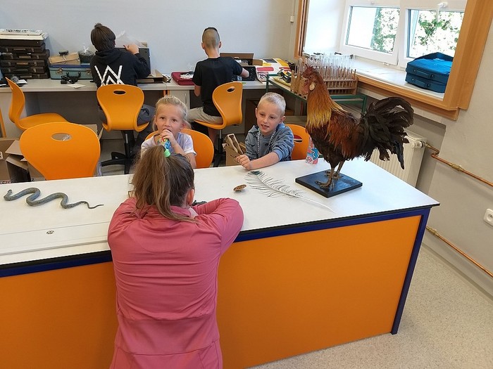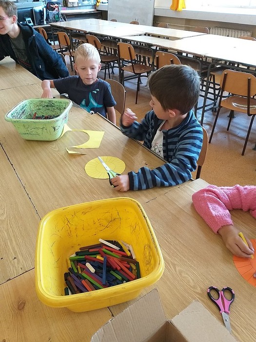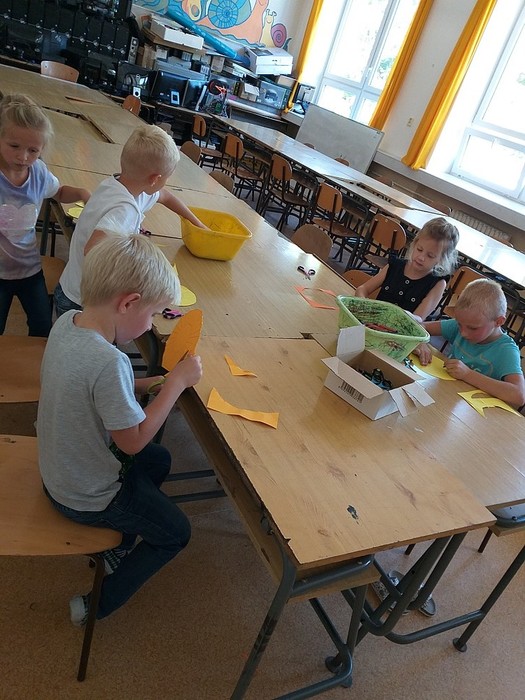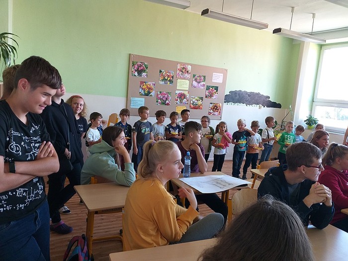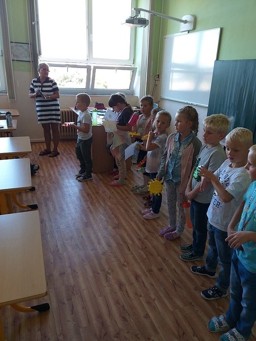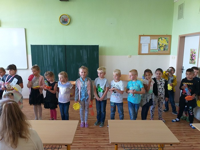 Letos si žáci deváté a osmé B připravili pod vedením Mgr. Světly Svatoňové šest atraktivních stanovišť po celé škole, kde všechny skupinky prvňáčků plnily rozmanité úkoly. Jednalo se o pokusy z chemie, poznávání přírody, počítačové hrátky, hudební hrátky, výtvarnou dílničku a tělovýchovné aktivity v tělocvičně.