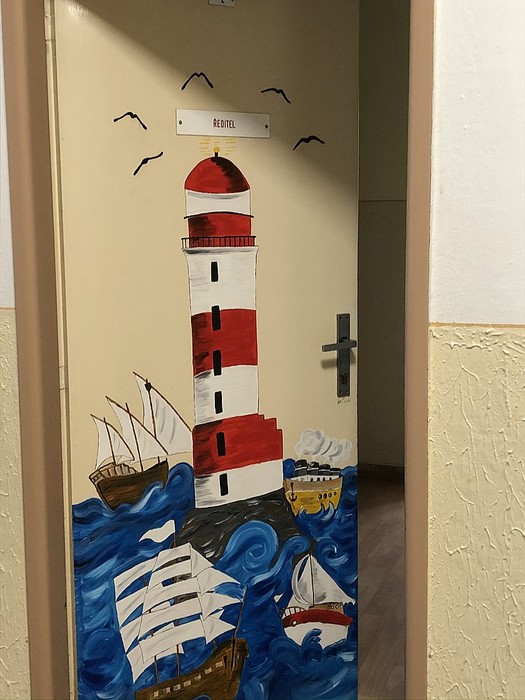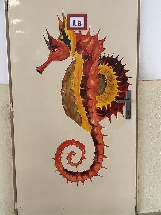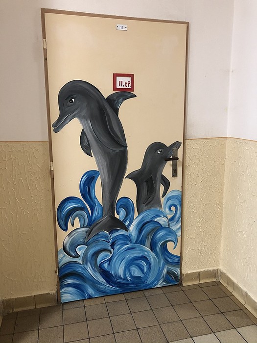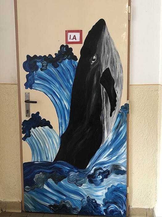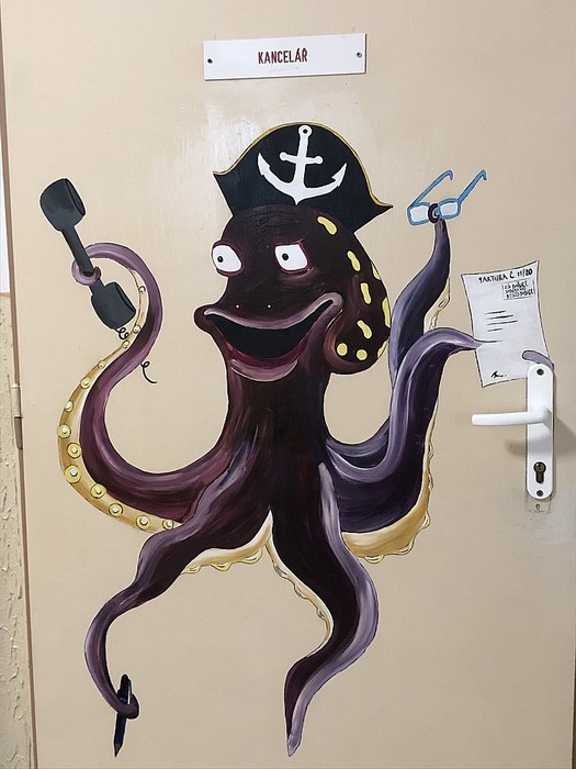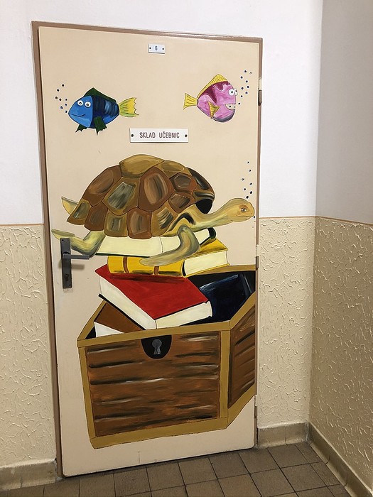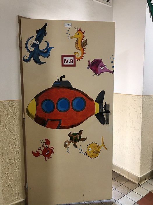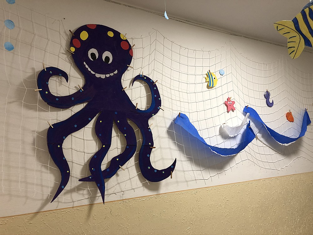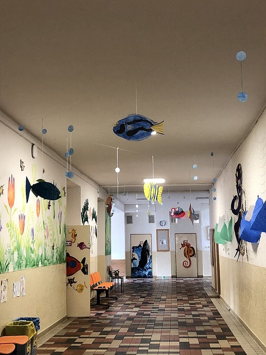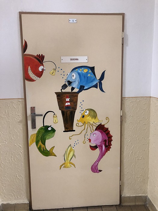 A naše škola? K výzdobě prvního patra jsme využili práce žáků osmých tříd. Jejich „létající ryby“ s dohledem krásné chobotnice vytváří vodní svět. Všemu dominují úchvatně namalované dveře s mořskými motivy od paní as. K. I. Svobodové.