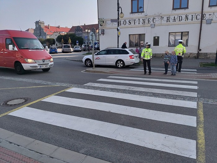 Praktický výcvik dvou skupin prvňáčků proběhl v Dašicích na náměstí pod vedením zkušených lektorů Policie ČR.