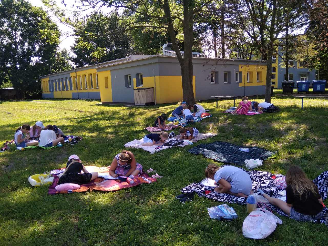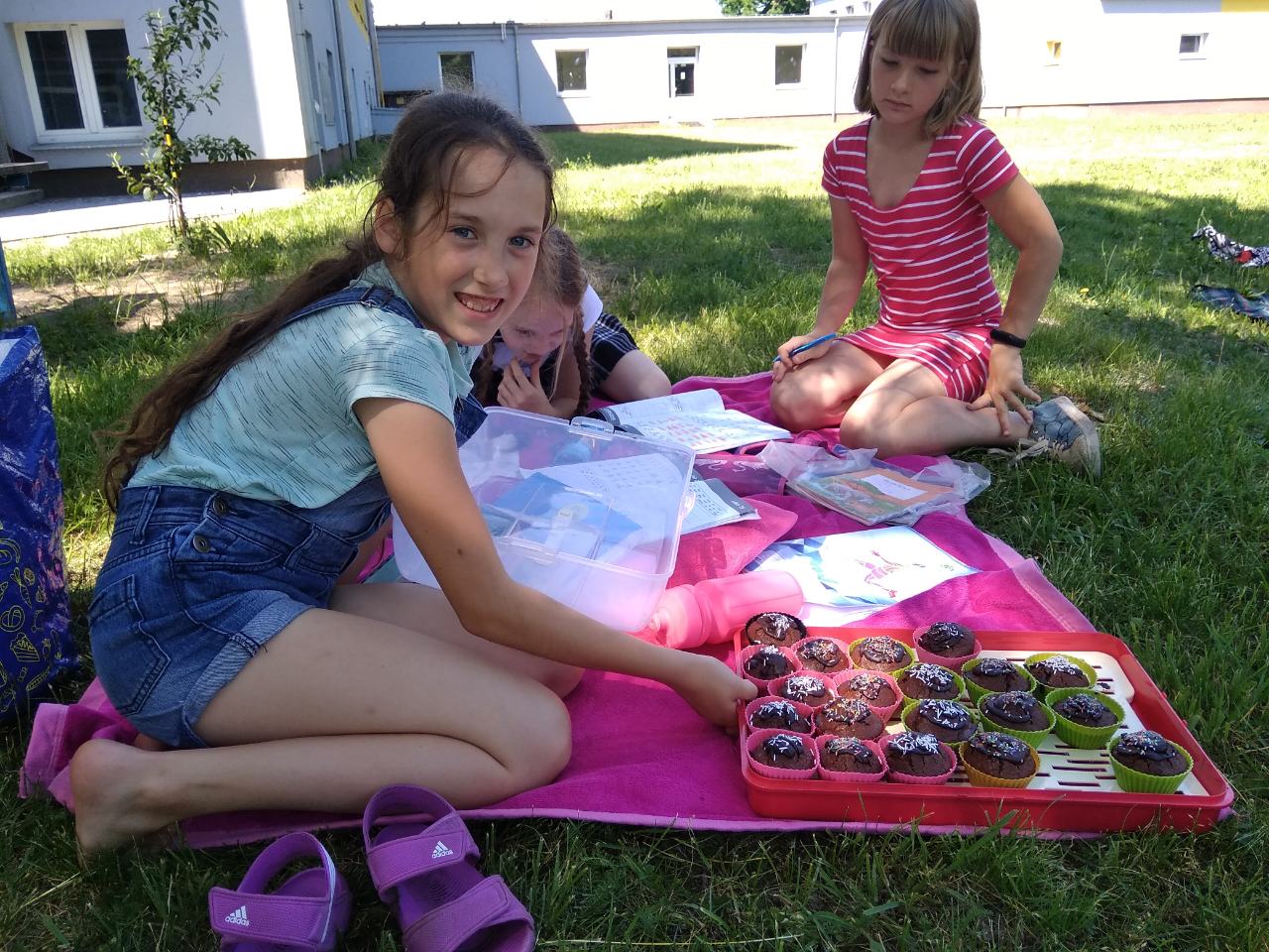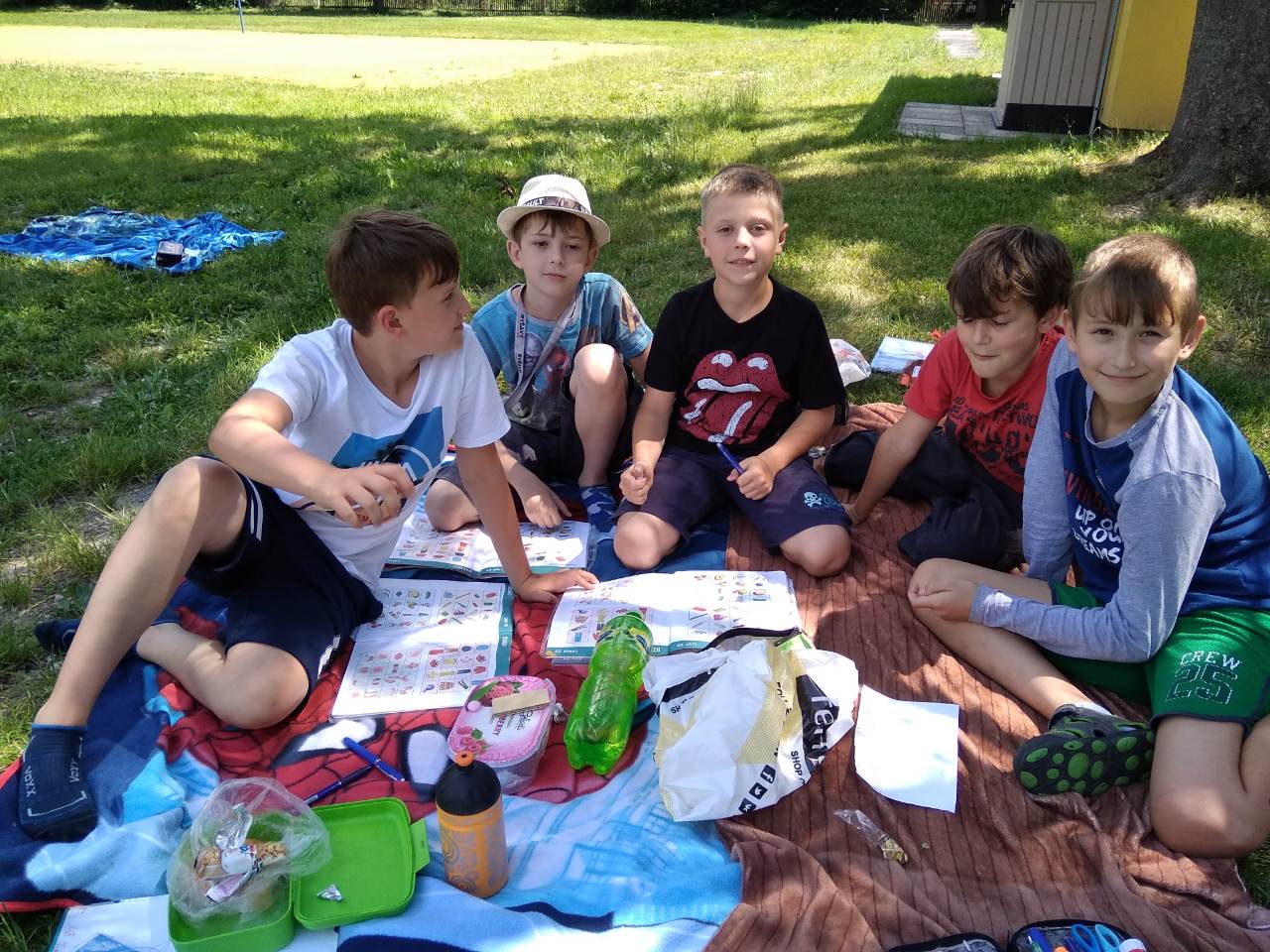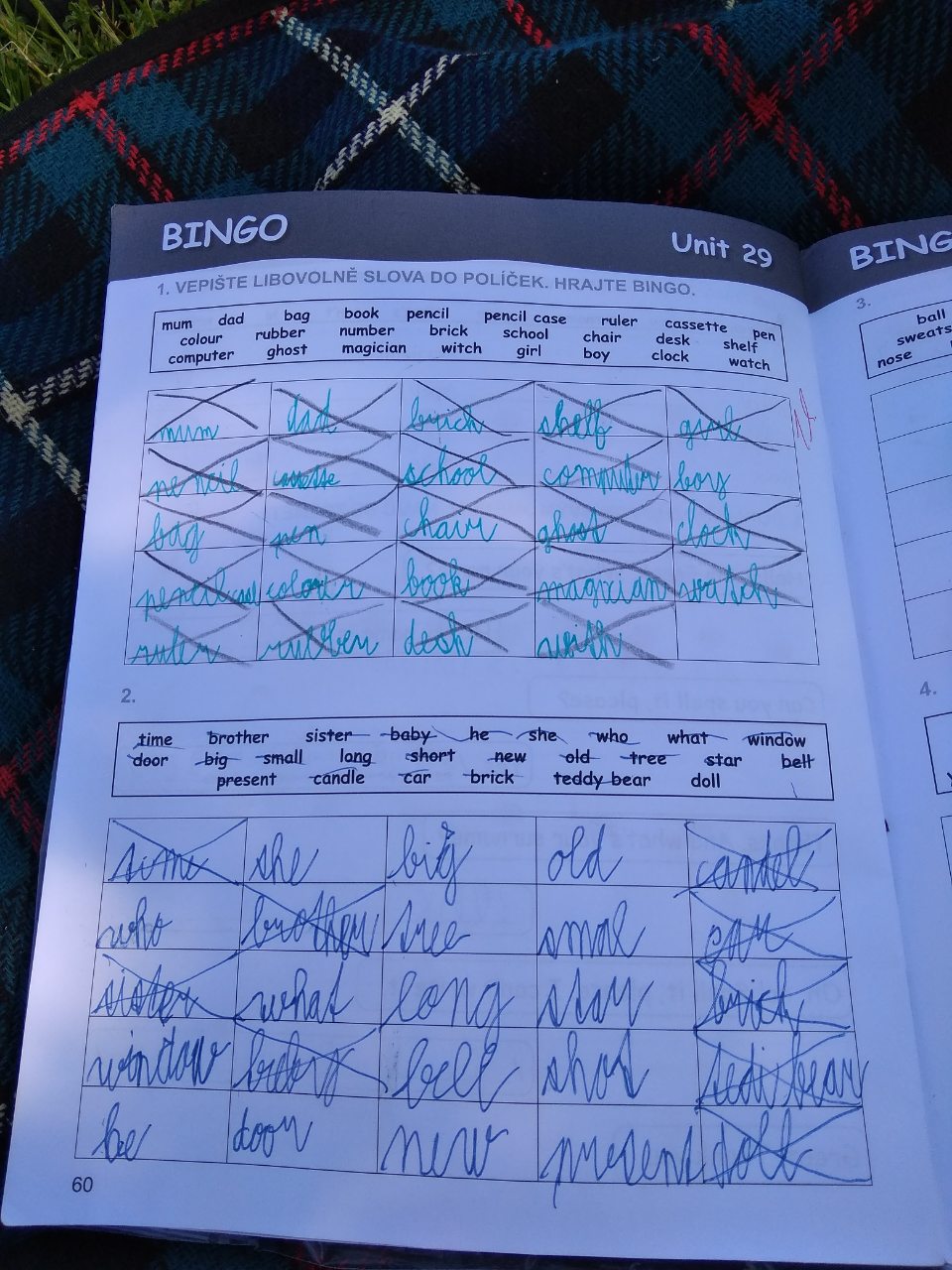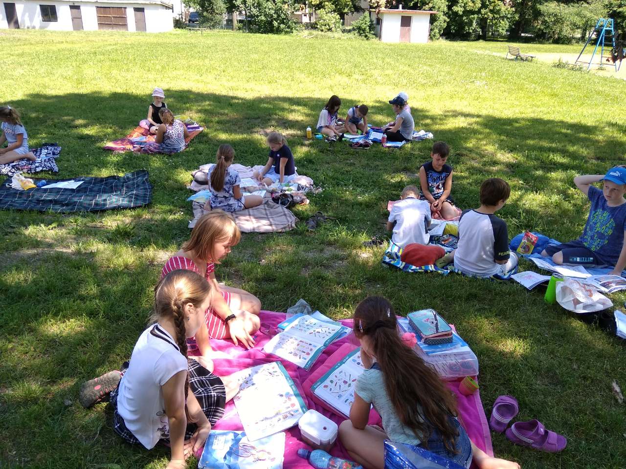 Takto jsme si užívali výuku venku na školní zahradě, žáci 3.A,B a 5.B spolu s žáky KOaj relaxovali na piknikových dekách a díky skvělé přípravě mňamek od rodičů nám šla práce pěkně od ruky, děti soutěžily o ceny, které jsme přivezli minulý týden z Anglie. Hledali jsme slovíčka,hráli Bingo, házeli míčem a pozorovali přírodu kolem nás...na závěr byla sladká tečka pro žáky KOaj, kdy jsme šli na místní výbornou zmrzlinu. Přejeme všem krásné prázdniny...už jsou téměř za dveřmi...
