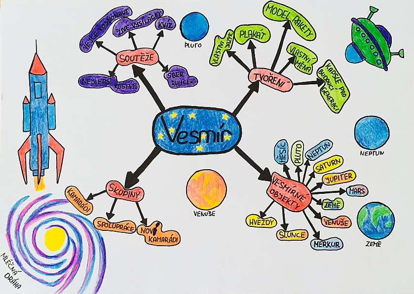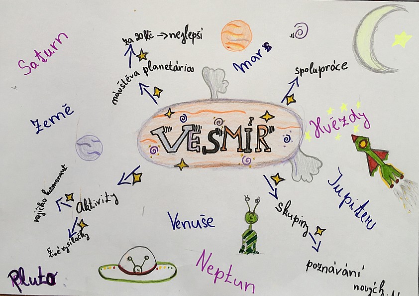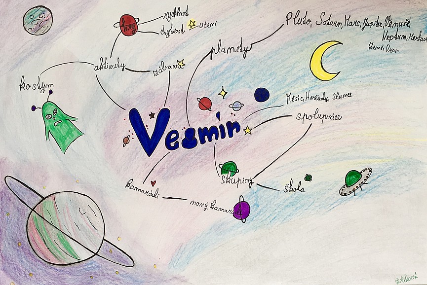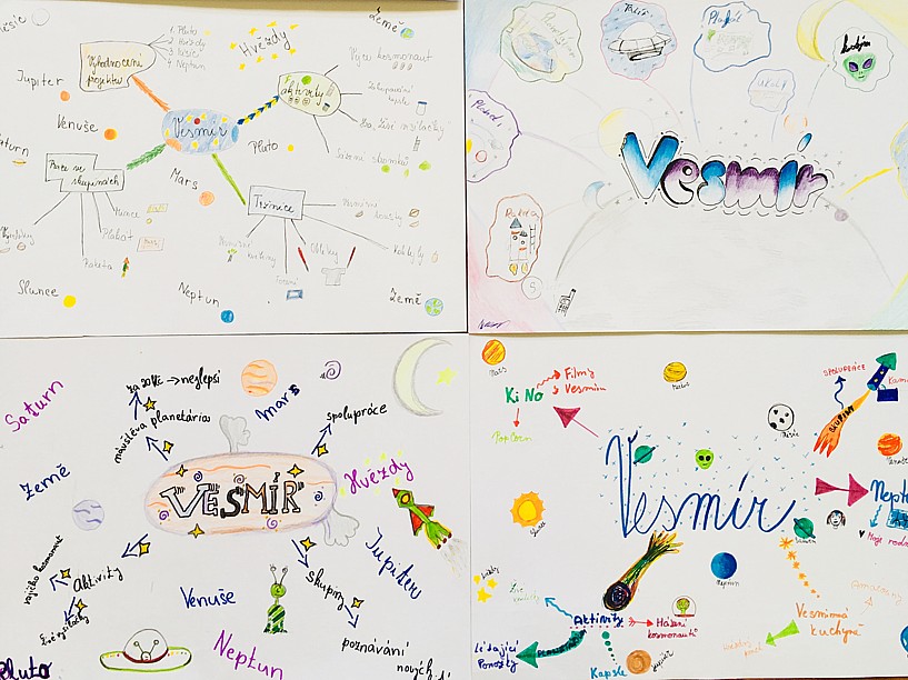 Společně se spolužáky z 9. třídy jsme pro vás nakreslili Stopařovy průvodce po Galaxii, myšlenkové mapy celého projektu.