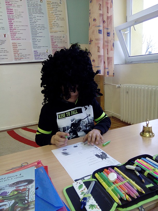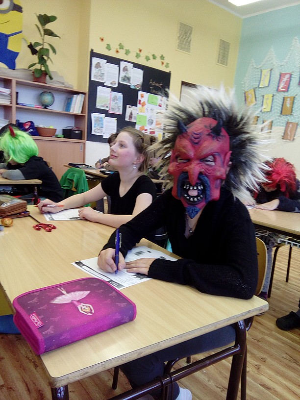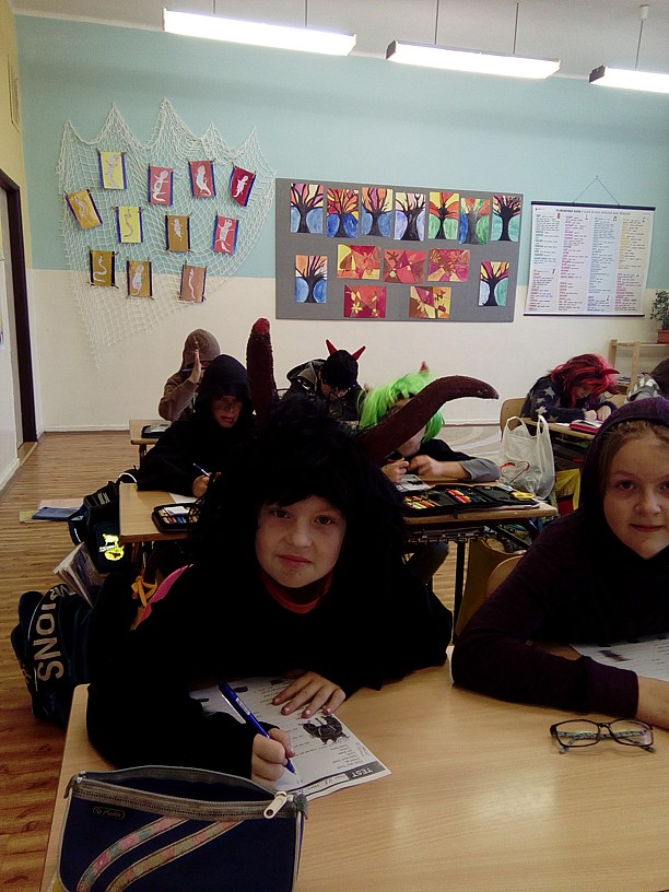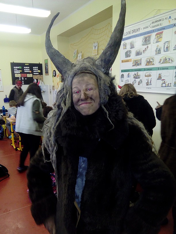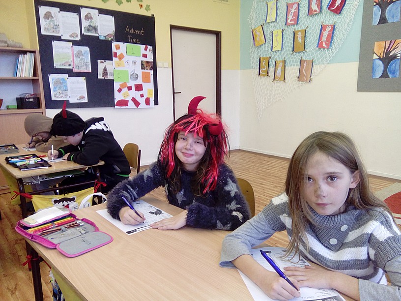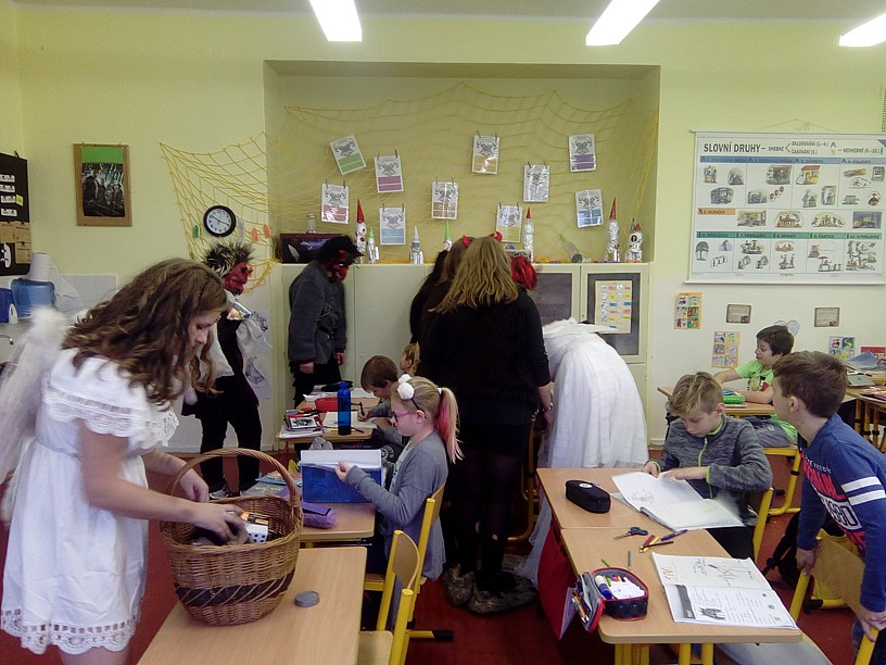 5. 12. byl ve třídách 4.A a B. čertí rej, samotní žáci se změnili v čerty a za úkol měli nakreslit čerta do pracovních sešitů a popsat maximálním počtem slov čerta v angličtině. Na konci hodiny přišly čerti z 9. ročníků pod vedením paní uč. Stránské. Andělé, čerti a dokonce i Mikuláš mluvili na malé čertíky čtvrtých tříd anglicky a hodnotili práci v sešitech. Těsně před zazvoněním byla krátká diskotéka a rej. Byla to skvělá hodina. Moc jsme si ji užili.