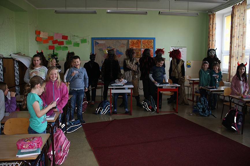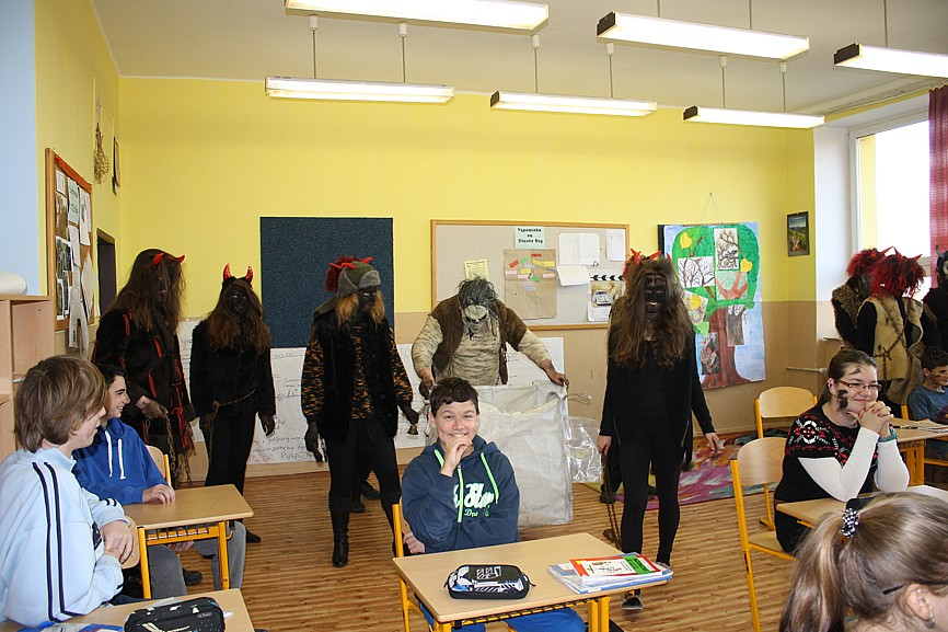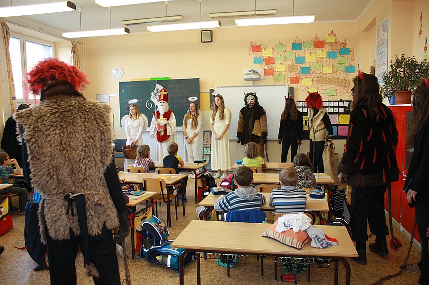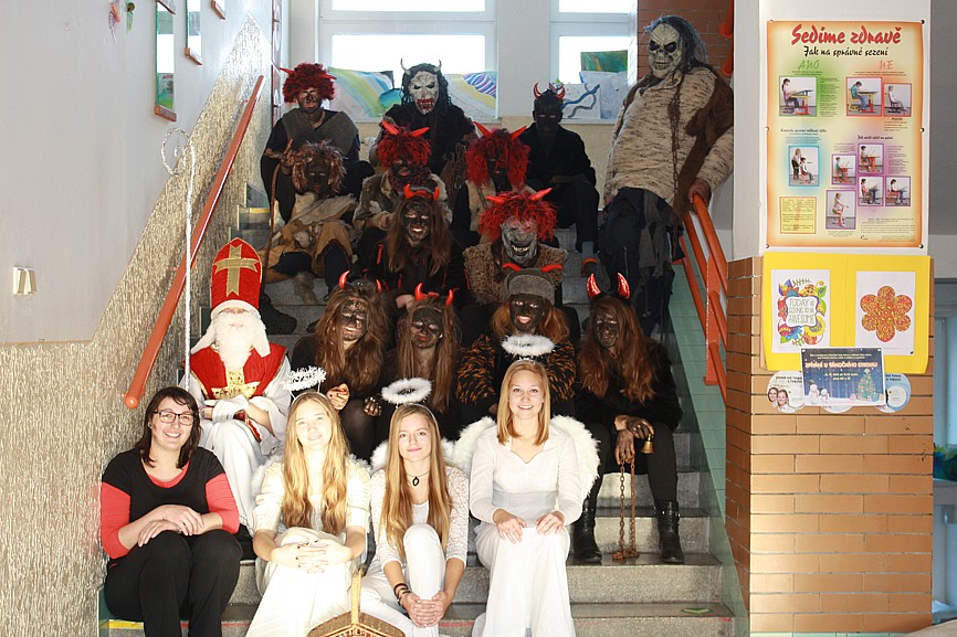 V pátek přišli do naší školy čerti, čertice a andělé s Mikulášem. Hodným dětem nadělili něco dobrého na zoubek. Zlobidla jak se patří potrápili, strčili do pytle a chtěli odnést do pekla. Nakonec zjistili, že se jim s tolika dětmi nechce nosit a všechny děti, když slíbily, že budou hodné, vrátili.