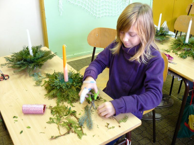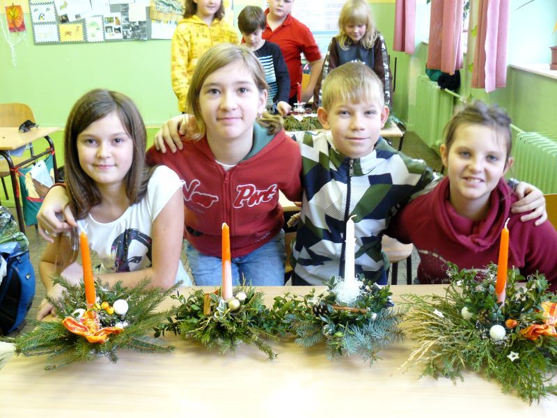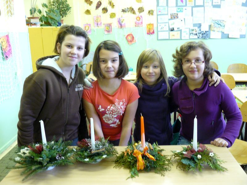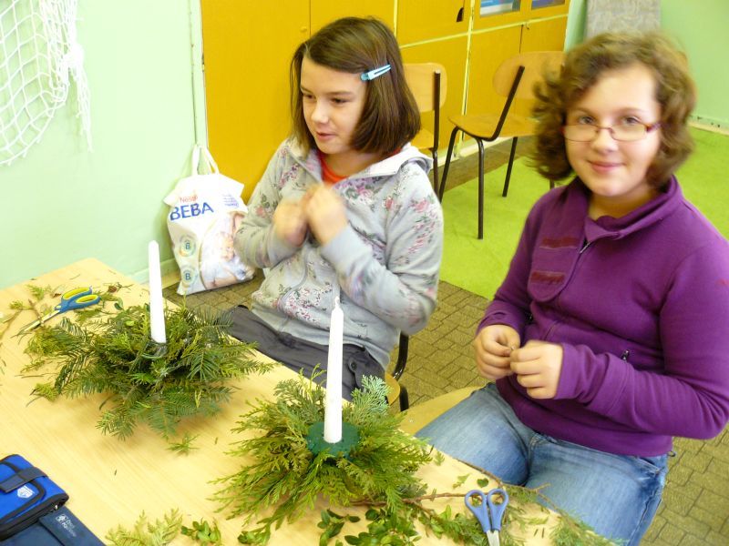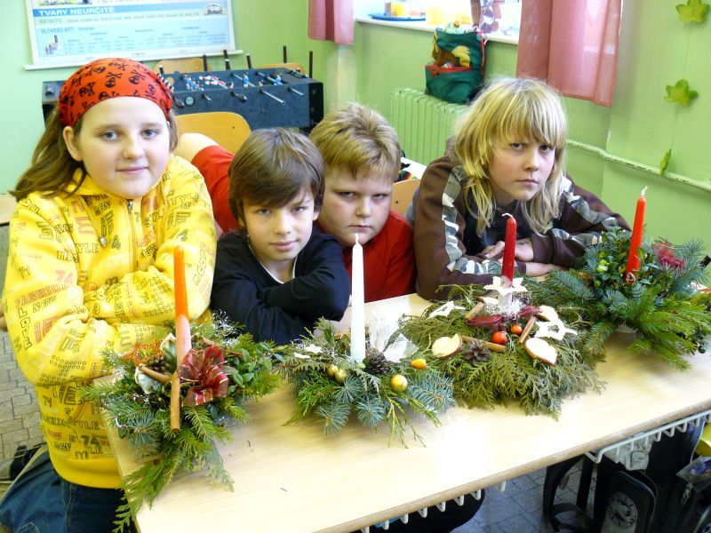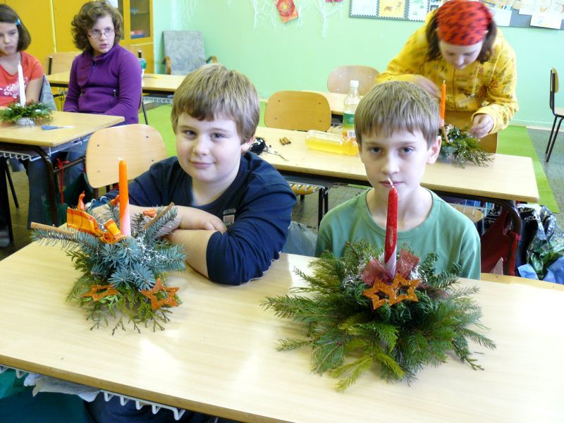 V pátek 16. prosince jsme si na lavice připravili místo učebnic větvičky z různých jehličnanů a tújí. Do třídy přišel pan Škoda z dašické „Květinky“. Pověděl a ukázal nám sváteční aranžování květin na stůl. A pak už jsme se pustili do práce. Nejprve jsme si do speciální hmoty dali svíčku a kolem ní různé větvičky. Každý si potom svůj svícen ozdobil různými „dozdůbkami“ (šišky, skořice, sušená jablka, pomeranč ….). Moc děkujeme panu Škodovi za jeho trpělivost, kterou nám věnoval.