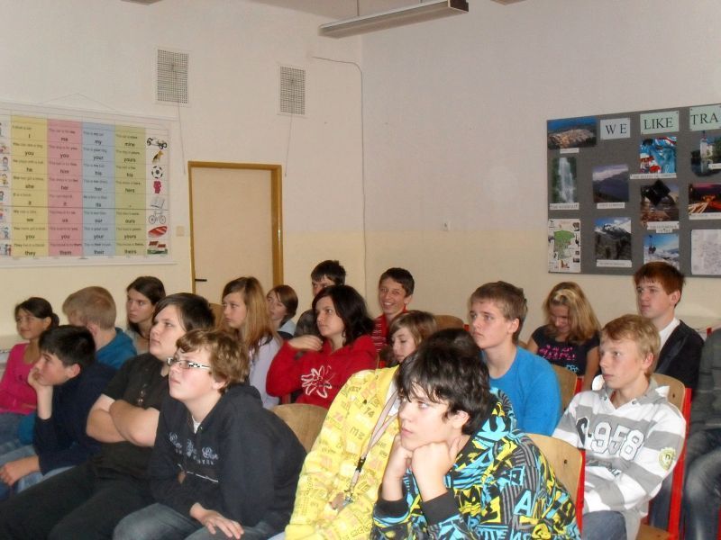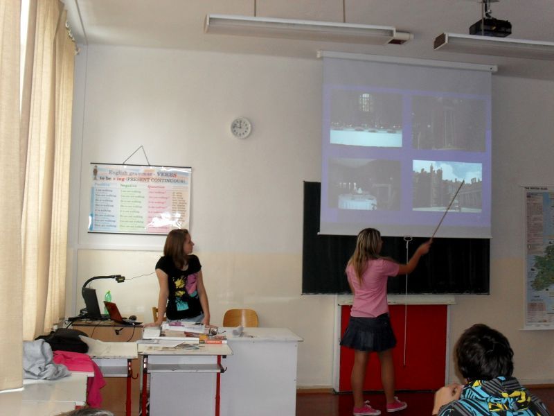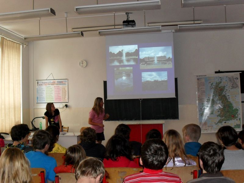 Využili jsme nabídky našich bývalých žákyň, Petry Marešové a Evy Krňanské, které studují ve 3. ročníku pardubického Gymnázia v Dašické ulici. Děvčata připravila hodinovou prezentaci ze svých aktuálních zážitků z návštěvy Anglie. Jejich cesta proběhla na počátku září tohoto roku, autobus se studenty kromě Londýna navštívil rodiště dramatika Shakespeara Stratford upon Avon, universitní město Oxford, megalitickou stavbu Stonehedge na salisburské pláni či mimolondýnské sídlo královny ve Windsoru.