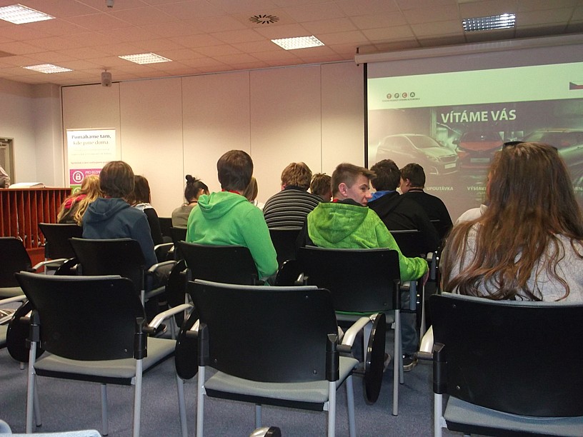 Šli jsme zpátky k autobusu a jeli do TPCA (Toyota Peugeot Citroen automobil). Jeli jsme kolem toho obrovského parkoviště s novými auty. Tolik aut pohromadě jsem snad ještě neviděl! Přišel pro nás ven nějaký pán, jehož jméno si nepamatuji a vzal nás do promítací místnosti, kde nás seznámil s pravidly a pustil nám jejich firemní dokument. Následně jsme si nasadili helmu a sluchátka, kde jsme poslouchali buď nahraný záznam, nebo výklad toho pána. Došli jsme do provozu a nasedli si do vláčku, kterým jsme jeli po určitých částech fabriky. Snažil jsem se poslouchat, ale spíš jsem se soustředil na to kolem mě, protože to bylo opravdu úžasné. Kolem nás jezdily vozíky ovládané na dálku, které převážely různé součástky. Nejvíc mě ale zaujali ti roboti, kteří byli snad všude. Byli obrovští a nejlepší bylo, že ti roboti dokonce i svářeli a byli při tom na desetinu milimetru přesní. Pak jsme jeli kolem finální části cesty auta, kde už ty detailnější věci a součástky nasazovali zaměstnanci TPCA. Poté jsme šli zpátky do promítací místnosti, kde jsme udělali pár fotek v té zajímavé soupravě. Ten pán nám ukázal různé grafy firmy, platy a měli jsme možnost zeptat se na cokoli.