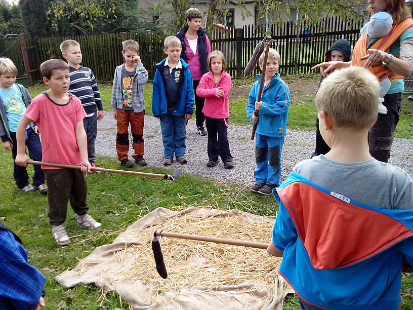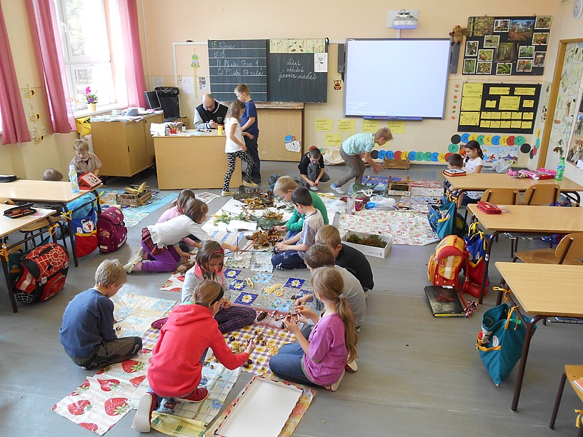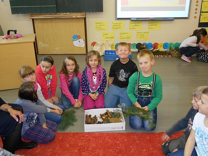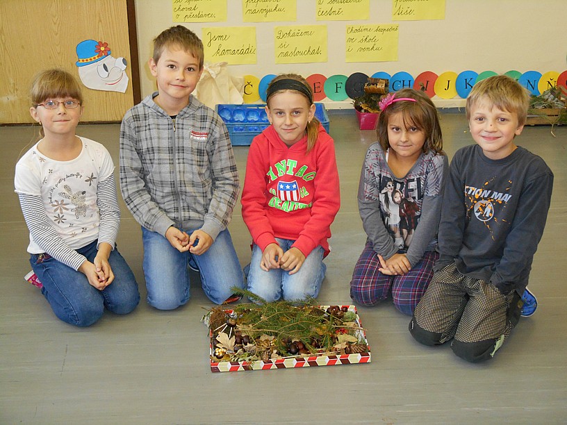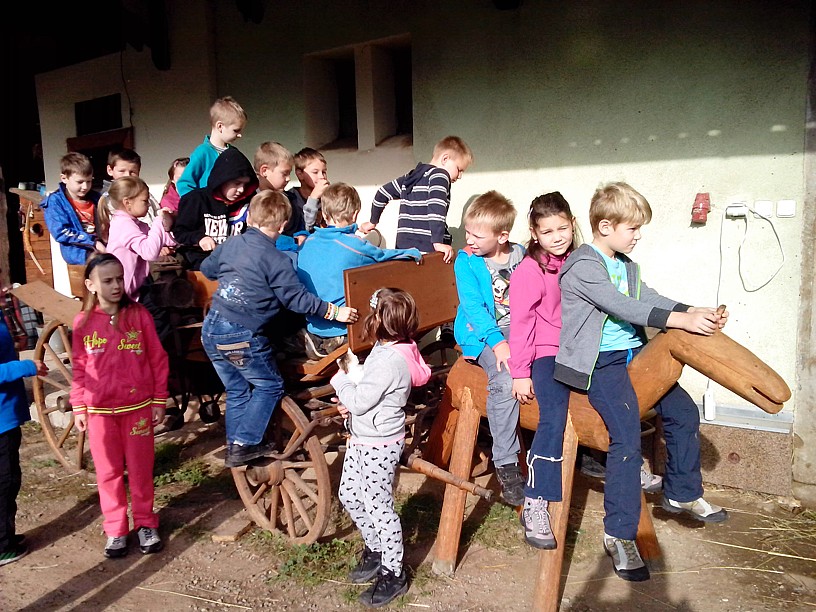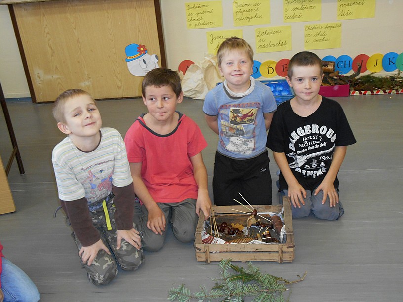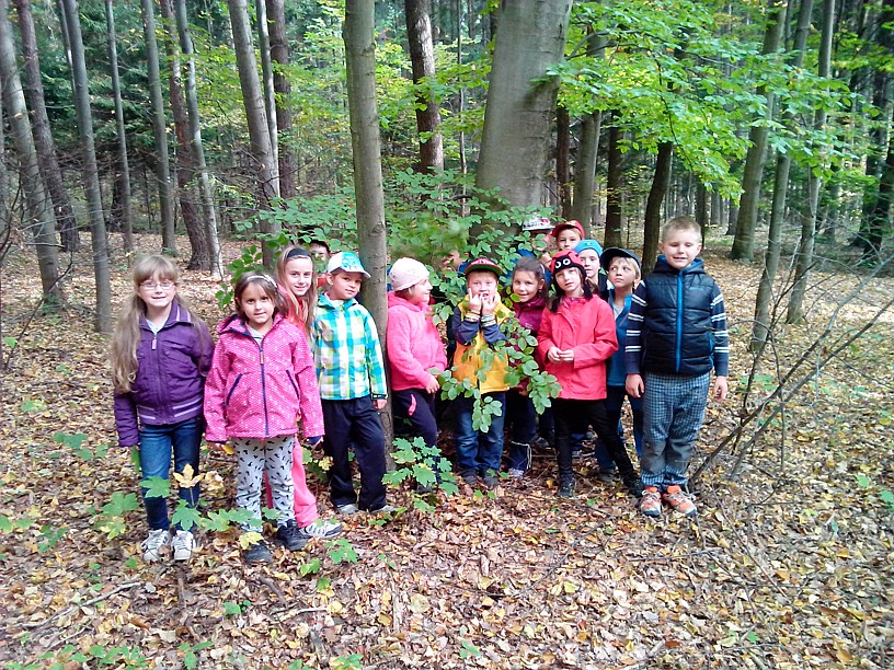 Ve čtvrtek 9. října jsme se vypravili na výlet za lesními skřítky. Nejprve jsme se stavili v Licibořicích na Babiččině dvorečku. Zde nás přivítala domácí zvířátka a my jsme je pod dohledem naší paní průvodkyně nakrmili a vyzkoušeli si různé hospodářské práce našich prababiček. Po práci na čerstvém vzduchu jsme si pochutnali na svačinkách od maminek a na vlastnoručně umotaných preclíkách. Pak jsme jeli do lesa, kde jsme na zemi i v korunách stromů hledali skřítky. Při této pátrací akci jsme byli úspěšní i ve sběru hub. Přírodniny, které jsme si z lesa přivezli, jsme použili při stavbě domečků pro lesní obyvatele.