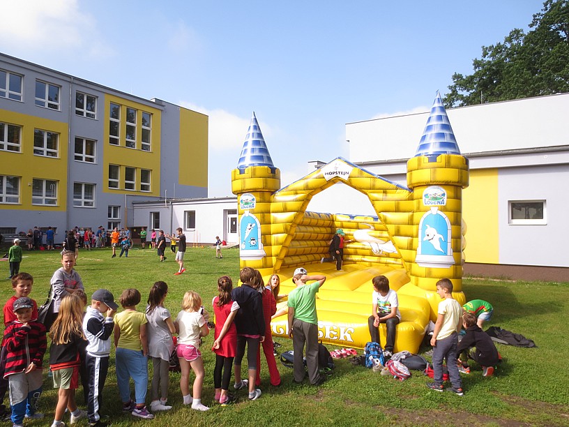 Kromě opalování si žáci mohli během jednotlivých disciplín odběhnout zablbnout na skákací hrad nebo se občerstvit nanukem či klobáskou ze školní udírny.