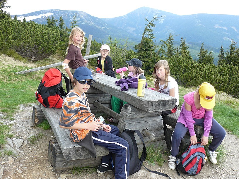 I v letošním školním roce jsme vyjeli do školy v přírodě. Páťáci se společně s druháky vypravili do Krkonoš. Již tradičně vlakem jsme z Kostěnic docestovali do Svobody nad Úpou, autobusem jsme pokračovali do Pece pod Sněžkou a pěšky vystoupali až k Jindřichovu domu. Poobědvali jsme, ubytovali se a vyrazili na prohlídku okolí. Dorazili jsme až na Václavák, ale ne ten pražský, a zahájili stavbu domečků z nalezených přírodnin. Odpoledne rychle uteklo a čas večeře nás přinutil vrátit se zpět.
