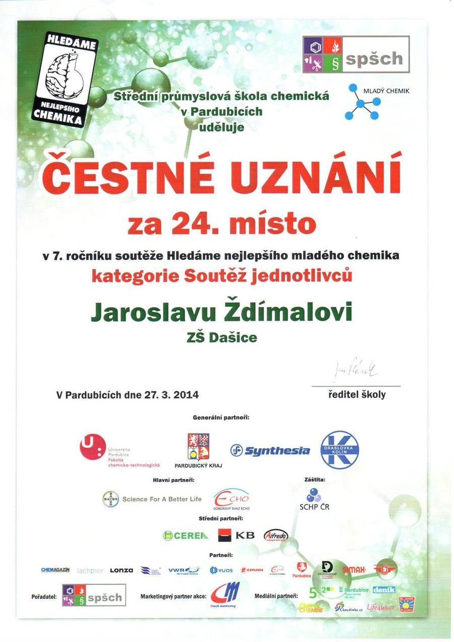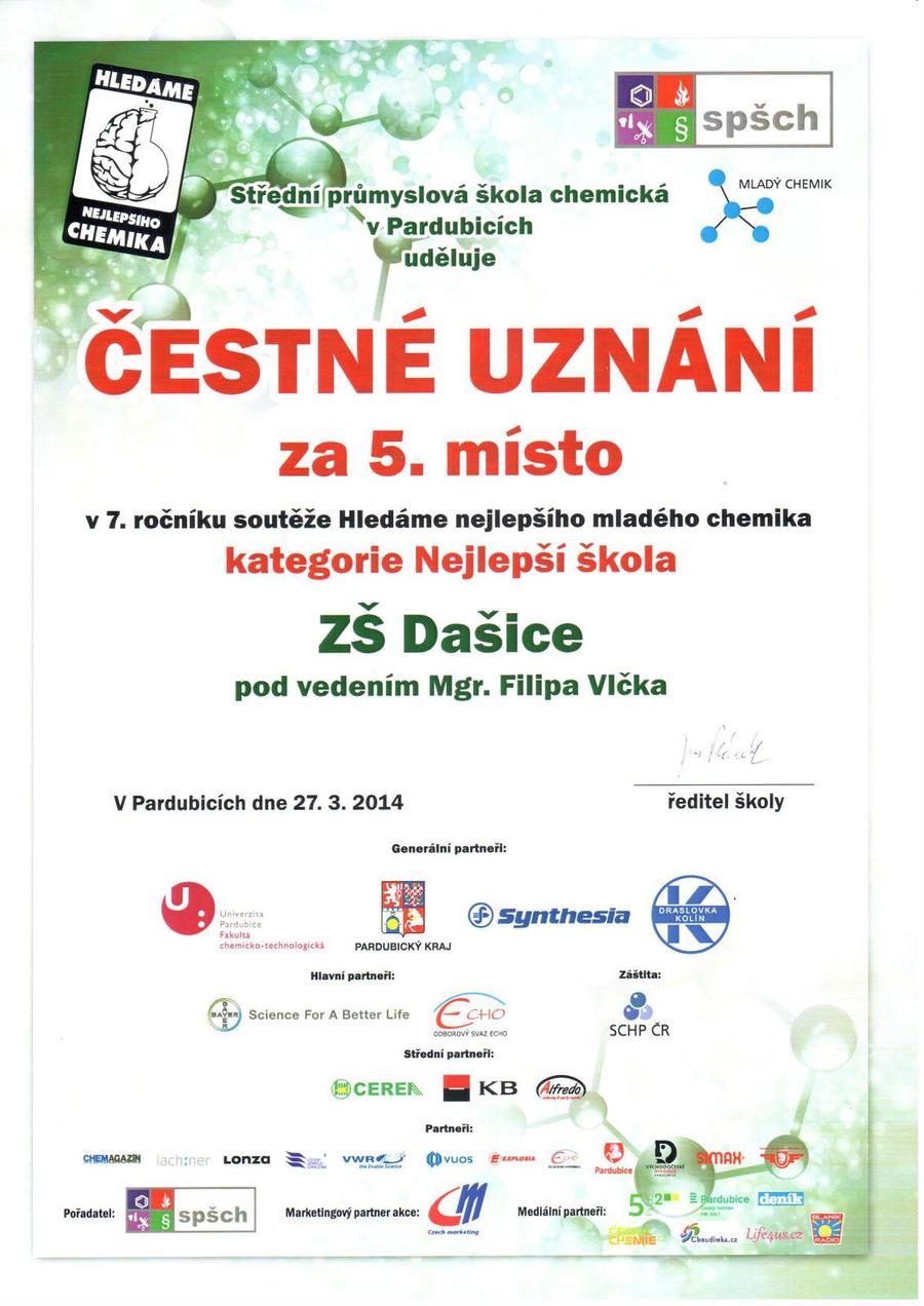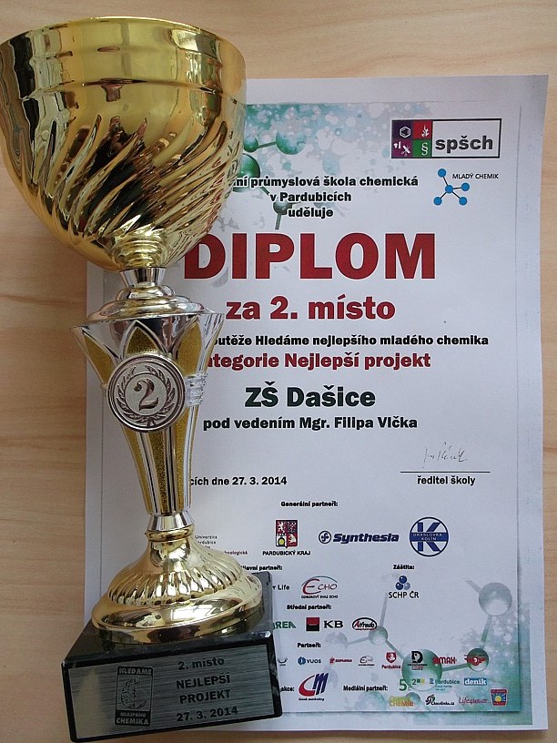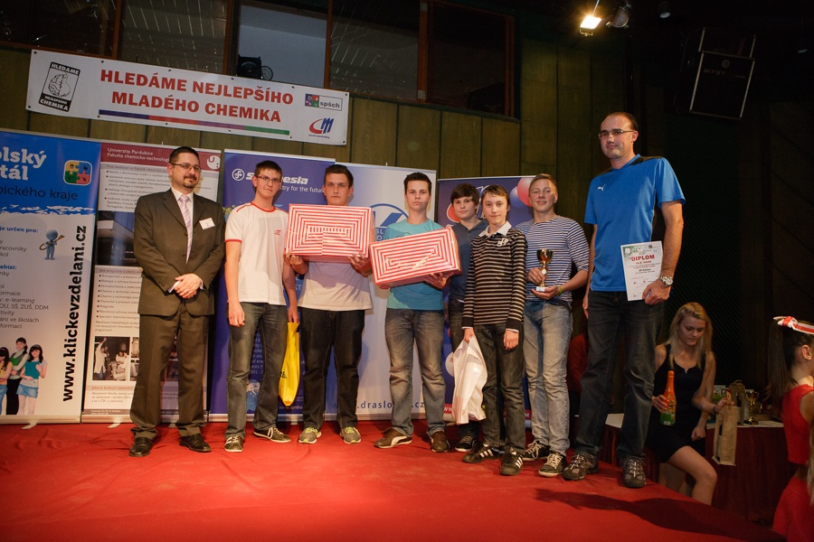 Slavnostní vyhlášení výsledků a předání hodnotných cen proběhlo 27. března 2014 v ABC Klubu na Olšinkách v Pardubicích. Chlapecký tým naší školy se svým „cukrem“ obsadil skvělé 2. místo v kategorii Nejlepší chemický projekt a odnesl si krásný pohár, spoustu nádherných cen, peněžní odměnu a pro školu skleněné laboratorní vybavení.