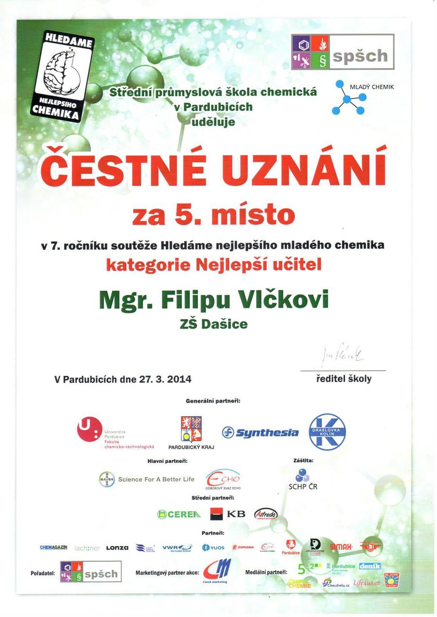 Filip Vlček, 5. nejlepší učitel chemie v Pardubickém kraji :-)
