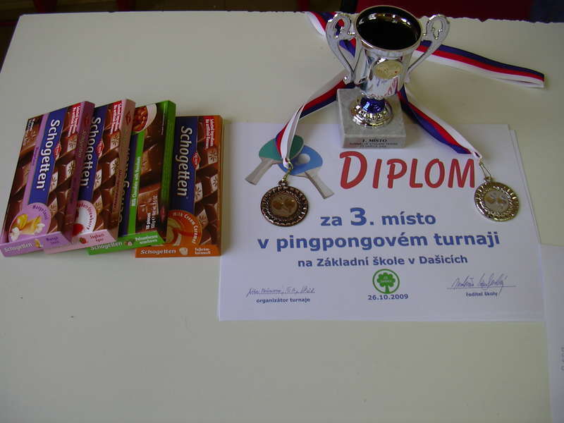 „V ZŠ Dašice se konal pingpongový turnaj v 6.A, zúčastnil se celý druhý stupeň. Rozhodčí byl pan učitel Vlček a zapisovatel paní učitelka Vaňousová. Můj první soupeř byla Kristýna Štrychová z 6.A, se kterou jsem vyhrál. Druhý soupeř byl Ondra Podnecký, docela jsem se ho bál, ale jak přišlo na souboj, už jsem byl v klidu. Třetího soupeře Michala Buchteleho jsem se bál asi nejvíc, ale taky jsem ho porazil. Čtvrtý soupeř byl Jirka Kosek, šlo mu to, ale byl poražen. Pak už mi zbýval akorát Vojta Dalecký, toho jsem se moc nebál, protože mu to nikdy extra nešlo, ale ukázalo se, jak moc jsem ho podcenil, hrozně se mu dařilo, bylo to samý prase, měl štěstí na smeče, no prostě se k němu přifařilo štěstí, a tak mě porazil. Byl jsem zklamán, že jsem skončil na druhém místě a Vojta na prvním. Aspoň jsem dostal oříškovou čokoládu a pěkně jsem si ji vychutnal, medaili mám pověšenou na skříňce za držátko a diplom ve vitríně. Doma jsem byl pochválen za výkon a vcelku jsem si to užil.“