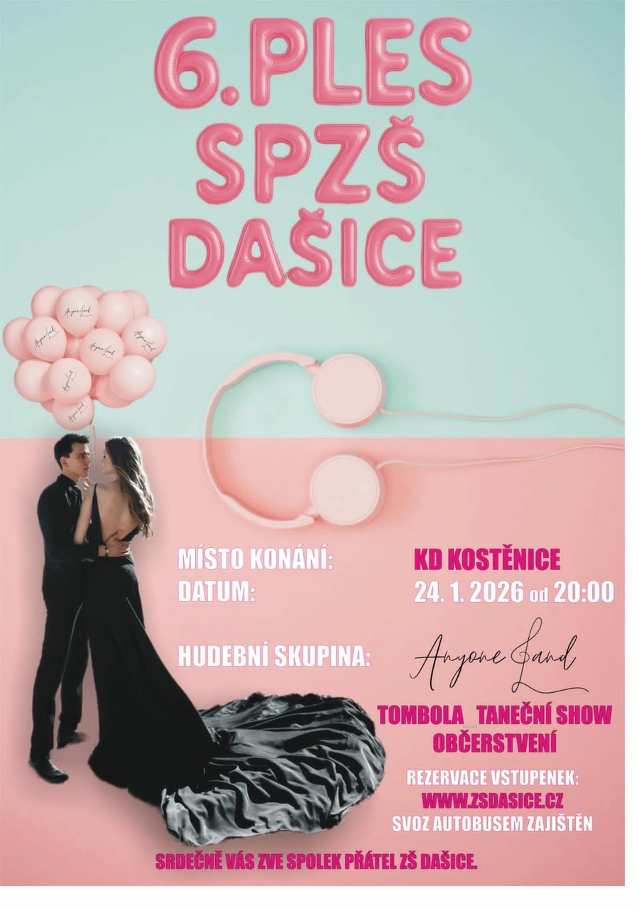Srdečně Vás zveme na ples Sdružení přátel Základní školy Dašice, který pořádáme v sobotu 24. 1. 2026 od 20:00 hod. v Kulturním domě v Kostěnicích.
