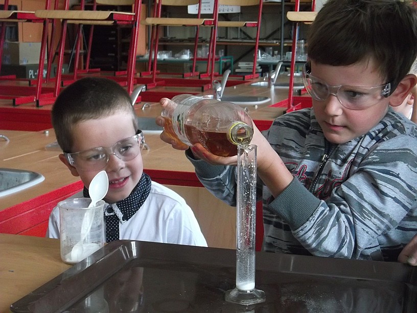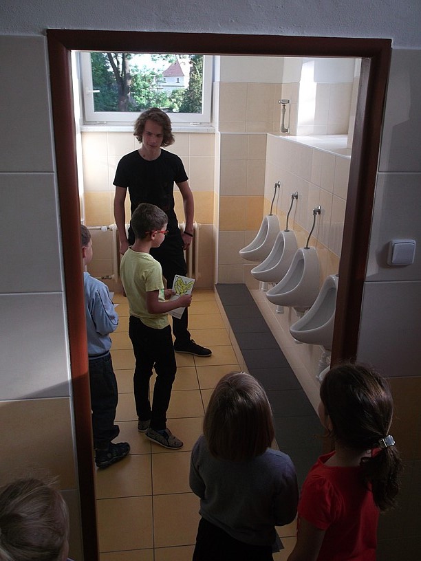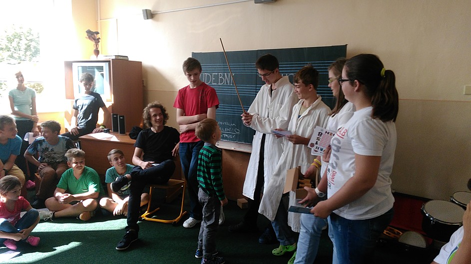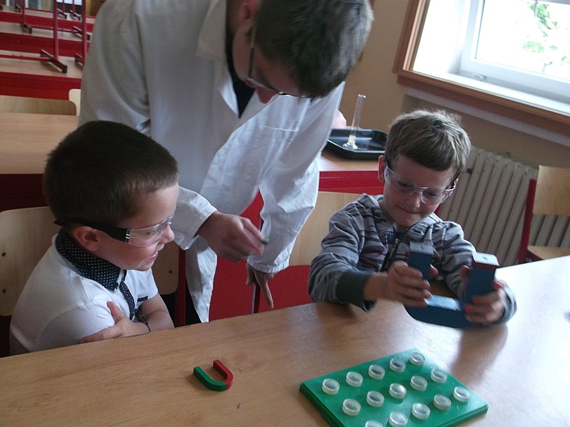 V pondělí 5. 9. 2016 jsme pro ně proto připravili akci s názvem „Uvádění prvňáčků“. Žáci deváté třídy a několik žáků osmé třídy si připravilo pro naše nejmenší žáčky zajímavý program v odborných učebnách, tělocvičně a na WC. V učebně chemie si děti míchaly různé lektvary, vyzkoušely si, jak bublá sopka a fungují magnety, v učebně hudební výchovy si zahrály na všemožné hudební nástroje a hezky si zazpívaly, v učebně přírodopisu poznávaly zvířátka, v počítačové učebně se učily pracovat v grafickém programu, v tělocvičně si řádně protáhli tělo a v učebně výtvarné výchovy si vymalovaly pokémona. Pokémoni naše prvňáčky provázeli celým programem a na jednotlivých stanovištích si vždy jednoho mohli ulovit.