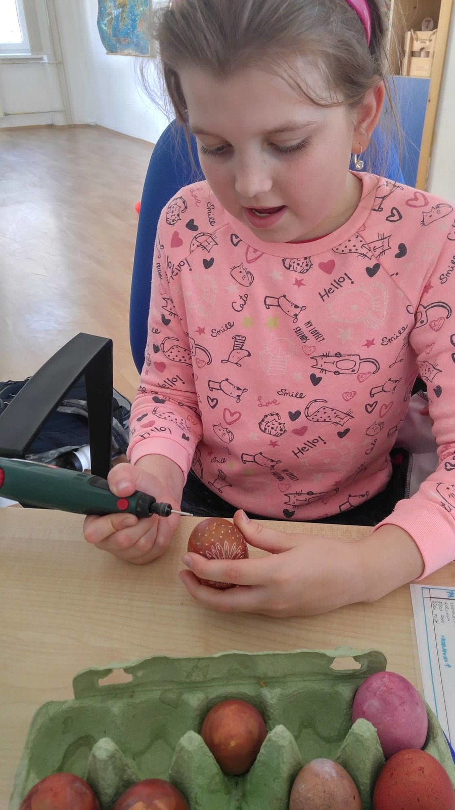Závěrem bych chtěla moc poděkovat rodině Vodrážkových za zapůjčení vrtačky, díky níž si mohly děti vyzkoušet novou techniku zdobení vajíček.