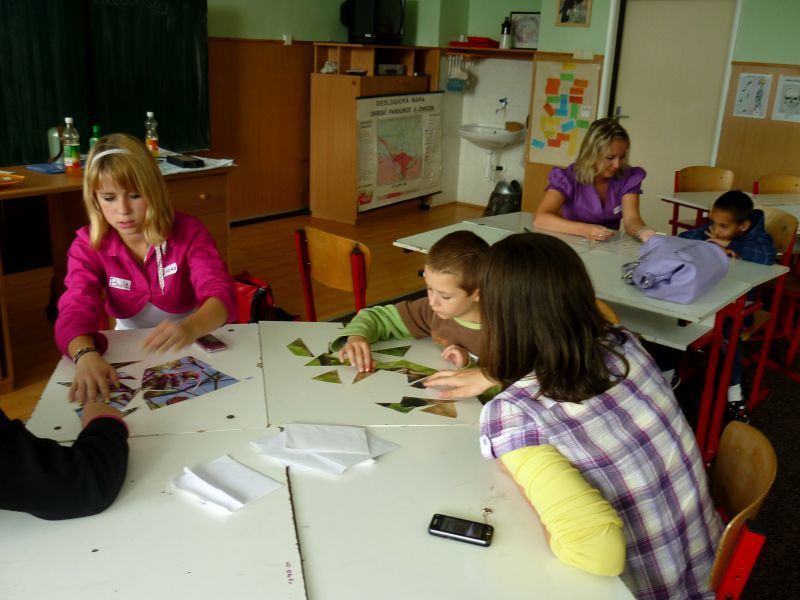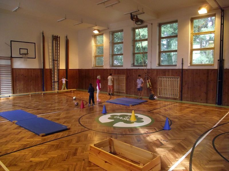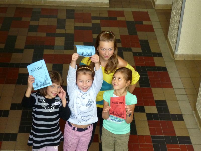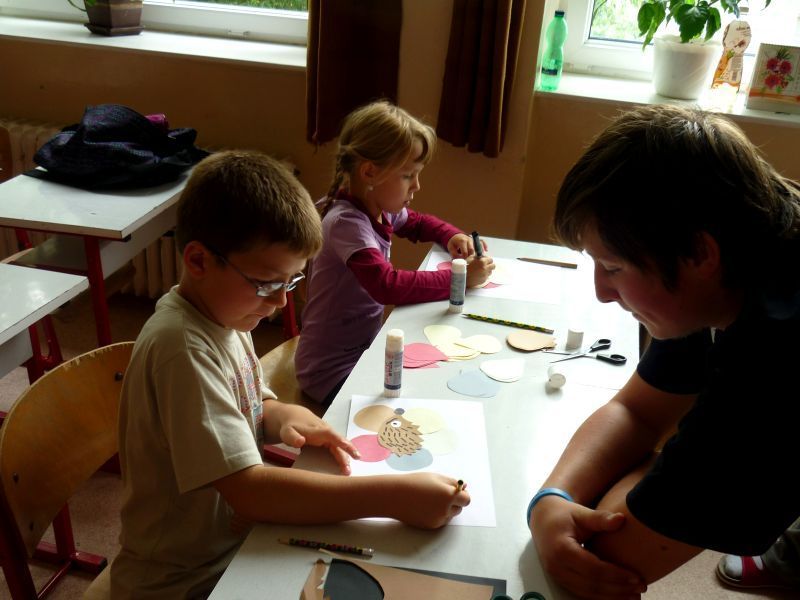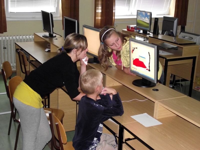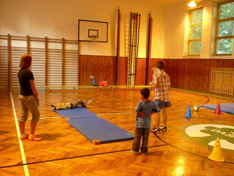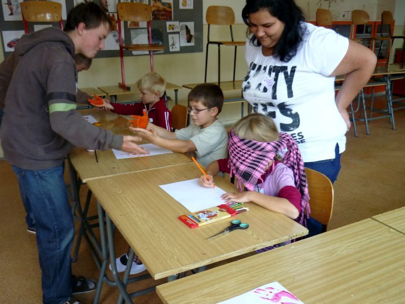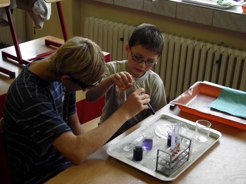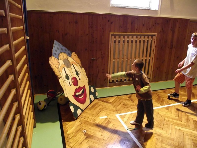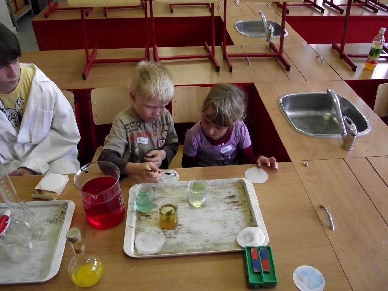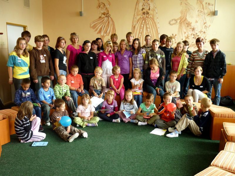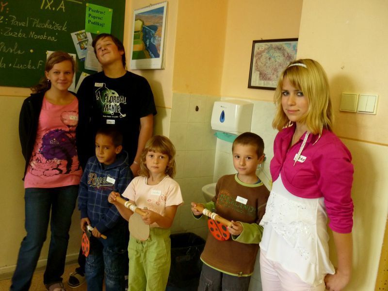 Na pátek 10.září jsme si pro ně připravili procházku po škole, která se skládala ze šesti zastávek. Zastávky jsme umístili do odborných učeben, takže i malí prvňáčkové si za pomoci nás, deváťáků, mohli zkusit něco z alchymie v učebně chemie, rozeznat vycpaniny v učebně přírodopisu, vytvořit umělecké dílo v učebně výtvarné výchovy nebo třeba namalovat obrázek prostřednictvím počítače v počítačové učebně. Nechyběla ani sportovní zastávka v tělocvičně. Prvňáčci na všech stanovištích prokázali statečnost a za to obdrželi i malé odměny.