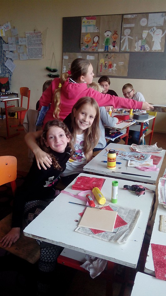 Na prodejní výstavě akce Čerti ve škole jsme se rozhodli nabízet vánoční kachličky polepené ubrouskovou metodou, které jsme vyrobili při pracovních činnostech. Nejdřív jsme si museli přinést z domu: kachličku, lepidlo, vánoční ubrousky a štětec. Ve škole jsme si umyli kachličku a připravili všechny věci. Potom jsme si natřeli lepidlem kachličku, na ni jsme nalepili připravený ubrousek. Ubrousek jsme potřeli lepidlem. Z jiného ubrousku jsme si vytrhali různé tvary. Tyto tvary jsme nalepili na kachličku s ubrouskem. Vytrhané tvary jsme potřeli opět lepidlem. Potom jsme hotové kachličky dali na okno zaschnout. Další den jsme je ozdobili vánočními hvězdičkami a kachličky byly na světě.